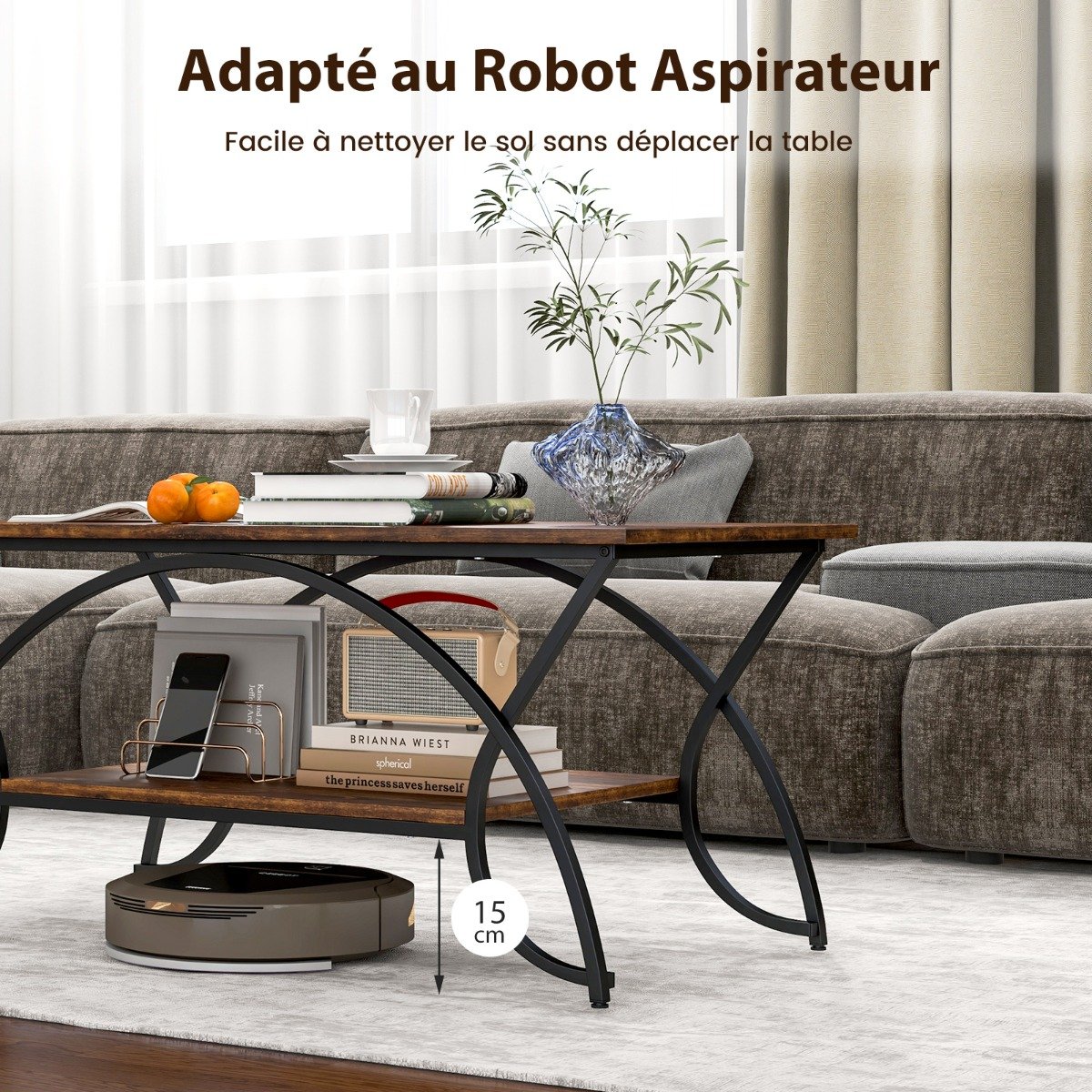 Com beleza e funcionalidade, esta moderna mesa de centro de luxo adicionará elegância e estilo à sua sala de estar e será o ponto focal da sua sala de estar ou área de entretenimento. Esta mesa de centro moderna é durável e elegante e complementará qualquer estilo de decoração. Além disso, as linhas elegantes, curvas e limpas da estrutura de suporte não só parecem requintadamente bonitas, mas também fornecem estabilidade extra. A mesa de centro de 2 níveis com armazenamento também é uma adição funcional à sua sala de estar. Você pode usá-la para exibir seus vasos e decorações favoritos, armazenar talheres ou servir chá da tarde. Atributos: Mesa de centro moderna e elegante: Combinada com a elegante estrutura preta, a mesa de centro moderna combina com os móveis de sala existentes de diferentes estilos e dá à sua sala de estar um toque moderno. Construção robusta e estável: A estrutura de metal resistente com acabamento preto elegante é bastante resistente, à prova de ferrugem e durável. Como os tubos de aço dobrados formam uma estrutura estável e de alta resistência, a estrutura da mesa de centro pode suportar um peso total de 70 kg (dos quais o tampo da mesa pode suportar até 50 kg). Design de 2 níveis: Além da aparência atraente, a mesa da sala de estar também apresenta um design funcional de 2 níveis para exibição e armazenamento. O espaçoso tampo da mesa medindo 100 cm x 50 cm (C x L) pode ser usado para colocar xícaras de café, laptops e vasos, enquanto a prateleira inferior é adequada para armazenar livros e outros itens pequenos. Detalhes atenciosos: Os tubos de aço são equipados com vedações de plástico e almofadas de pé ajustáveis ​​para evitar arranhões e aumentar a estabilidade geral da mesa lateral. Além disso, a prateleira inferior é elevada a 15 cm do chão, o que não dificulta a limpeza do chão, mas facilita a varredura do aspirador robô. Fácil de montar e limpar: A mesa de sofá de 2 níveis é fácil de montar se você seguir as instruções passo a passo. E as peças etiquetadas são fáceis de identificar. Além disso, o amplo tampo da mesa e a estrutura de metal são à prova d’água e fáceis de limpar, exigindo apenas manutenção diária simples e rápida. Características: Linhas finas e o belo formato arqueado combinam estilo e robustez A mesa de centro de 2 níveis expande o espaço de armazenamento e mantém o ambiente organizado As almofadas ajustáveis ​​para os pés mantêm a mesa estável e evitam arranhões O tampo da mesa liso e à prova d’água facilita a limpeza da sujeira A prateleira inferior elevada deixa espaço suficiente para limpeza A estrutura de metal robusta e pintada é elegante e à prova de ferrugem