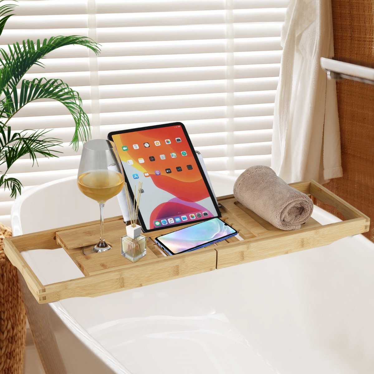 Bandeja organizadora de bambu para banheira com suporte ajustável para livros – cor natural