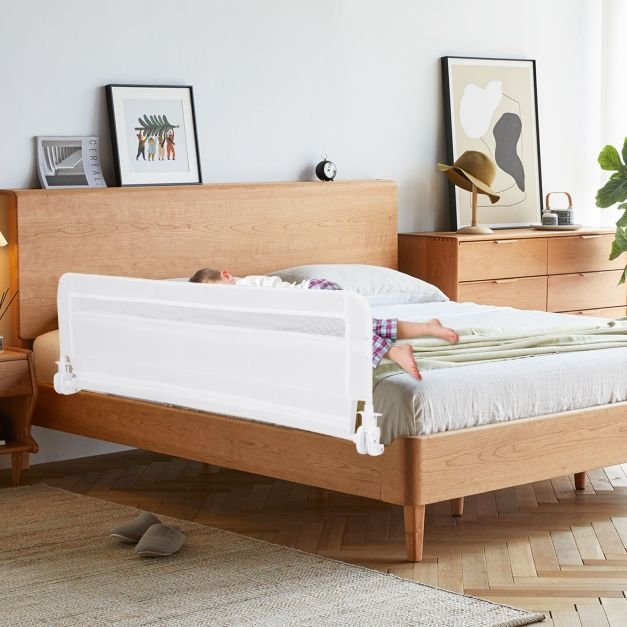 Feito de materiais confiáveis e livres de BPA, este guarda-corpo possui uma vida útil longa. Este guarda-corpo para cama de bebê oferece um design dobrável que facilita o acesso das crianças à cama. Com uma tira de fixação incluída, o guarda-corpo da cama pode ser fixado sem esforço à cama. Etapa 1: segure as duas pernas sob o colchão. Etapa 2: aperte a tira ao longo da parte inferior do colchão. Etapa 3: fixe o disco no lado oposto. É adequado para camas com estrutura de metal, camas de couro, camas de madeira e camas box. Construção robusta em metal: este guarda-corpo de 100/120 cm possui uma estrutura de metal com uma barra transversal adicional para reduzir a distância entre a cama e o guarda-corpo, garantindo um ambiente de sono seguro para seu filho. Os cantos arredondados e as mangas de espuma anticolisão fornecem segurança extra. Materiais duradouros e seguros: a malha respirável e a capa resistente são livres de BPA, seguras para as crianças usarem, e os pais podem monitorar seu filho a qualquer momento. A capa removível e lavável com um zíper suave foi projetada para uma manutenção conveniente. Design dobrável conveniente: esta grade dobrável para cama de bebê facilita a entrada e saída das crianças da cama. Além disso, o processo de dobragem é simples. Os pais só precisam levantar a junta para destravá-la e dobrá-la facilmente. Fácil instalação na cama: com botões de mola, a montagem é fácil sem ferramentas. Além disso, o pacote vem com uma alça de segurança e um sistema de fixação confiável para oferecer uma instalação fácil e resistente à cama dos pais. Adequado para vários tipos de cama: esta proteção para grade de cama infantil é compatível com camas de estrutura de metal, camas de couro, camas de madeira e camas box. O pacote inclui uma peça de grade de cama, mas você pode escolher mais para maior segurança.