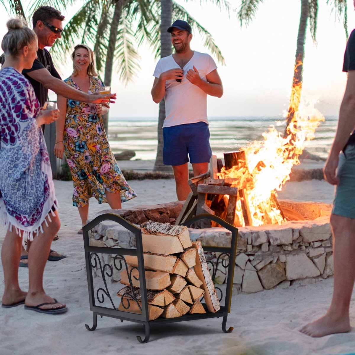 Suporte para lenha de lareira em ferro forjado para uso interno.