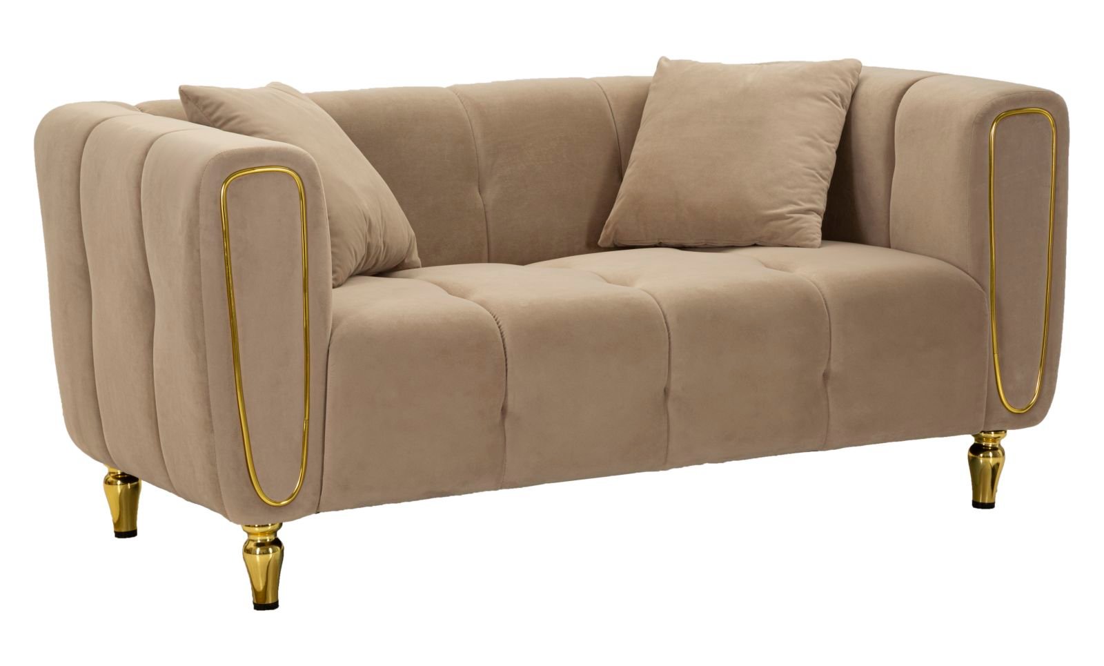 Sofá de dois lugares cinza pomba com pés dourados para montar, forrado em veludo acolchoado. Ideal para ambientes modernos e requintados, acrescenta um toque de luxo e conforto.