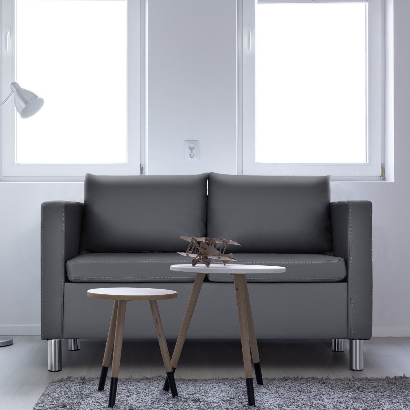 Este sofá-cama possui almofadas grossas e travesseiros combinando, oferecendo um lugar confortável para sentar e relaxar. O assento macio e confortável, com detalhes em couro PU, reveste a espuma de alta densidade. Projetado com um encosto que se adapta perfeitamente às suas costas, aliviando a pressão na coluna, o sofá-cama possui apoios de braço altos para maior conforto. A estrutura de madeira maciça oferece um sofá estável e durável, com 4 pés de metal e capacidade de peso de 240 kg. O design simples do nosso sofá-cama de 2 lugares complementa facilmente a decoração da sua casa e/ou escritório. O sofá é adequado para qualquer ambiente, como sala de estar, quarto e sala de recepção. Não hesite em adquirir o seu! Fácil de montar, seguindo as instruções detalhadas fornecidas, e fácil de limpar. Assento espaçoso para máximo conforto. O encosto e os apoios de braço ajudam a aliviar a pressão. Projetado com 4 pés de metal para boa capacidade de carga. Feito com materiais premium para maior durabilidade. Perfeito para sala de estar, quarto, sala de recepção, etc.