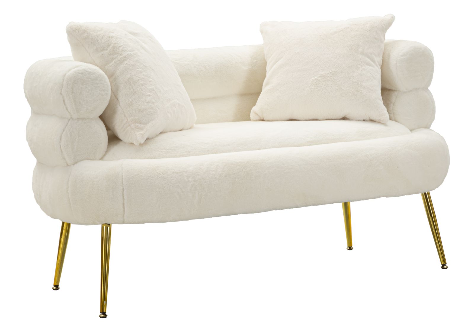 Sofá branco de dois lugares com pernas douradas para montar, forrado em pele sintética macia. Ideal para ambientes modernos e requintados, acrescenta um toque de luxo e conforto.