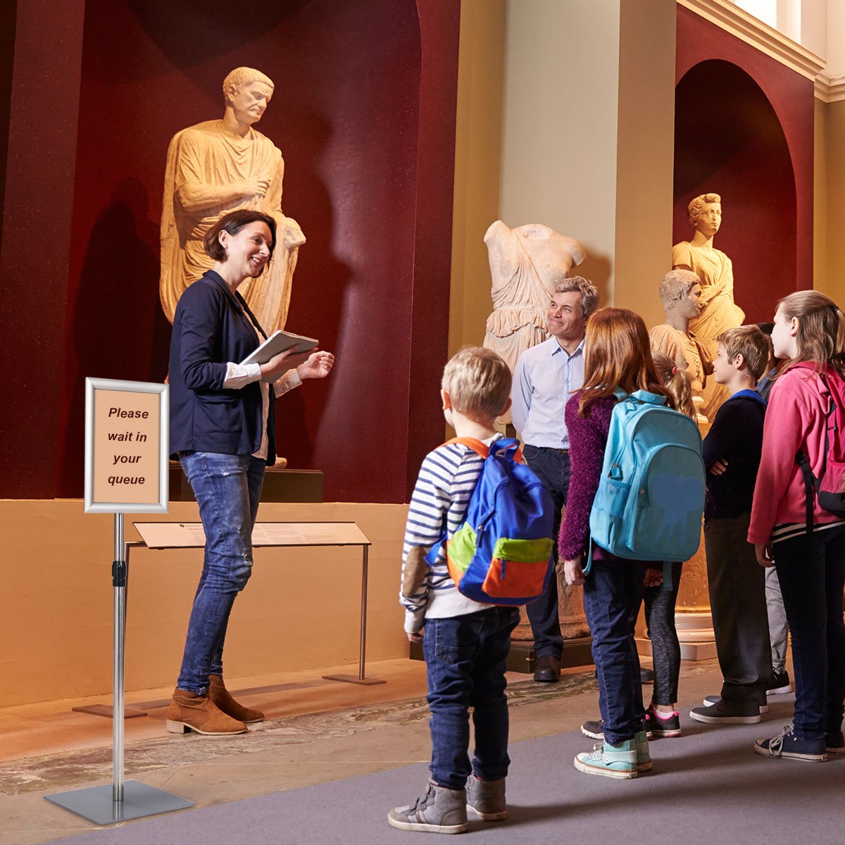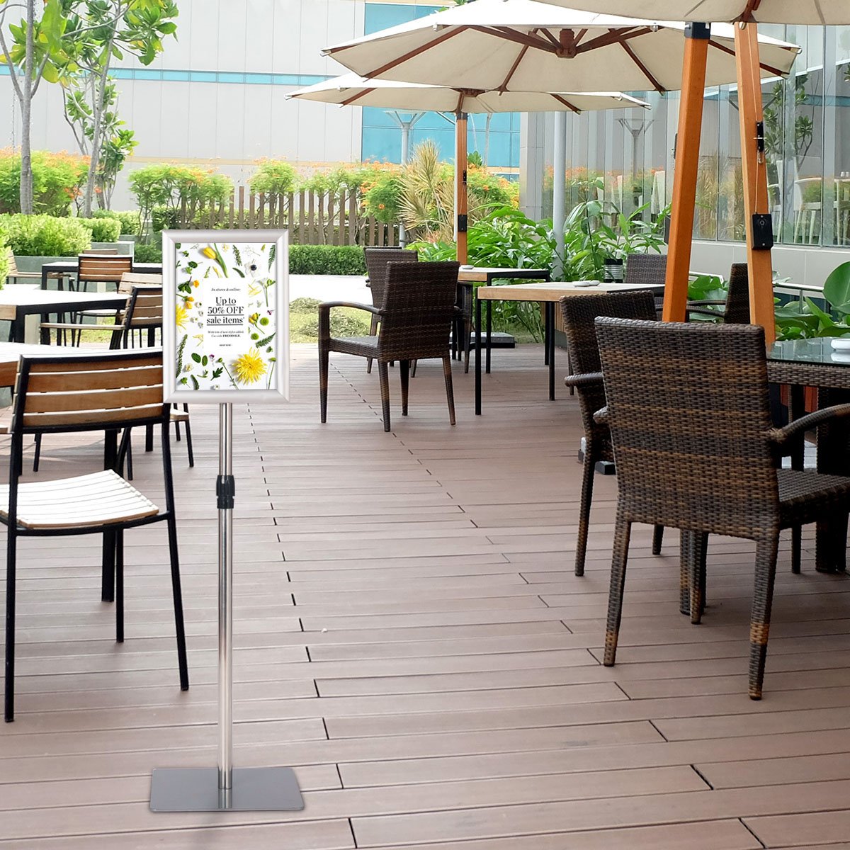 Este suporte de informações simples e prático é a escolha ideal para exibição e publicidade em locais públicos. Com estrutura de alumínio e suporte de aço inoxidável, que é duradouro e sólido. Agora é fácil e econômico anunciar suas promoções ou ofertas com este suporte de apresentação. Atributo: Altura ajustável – A alavanca de altura é livremente ajustável para facilitar seu uso em diferentes situações. Robusto e durável – A estrutura do pôster do suporte de informações é feita de alumínio, o suporte é feito de aço inoxidável. É anticorrosivo e tem uma longa vida útil. Destacável – Quando você não precisa usar este suporte de exibição, ele pode ser desmontado para fácil armazenamento. Segurança – A placa de base pesada e à prova de ferrugem garante estabilidade para o suporte de informações, proteção contra ferimentos através dos cantos da estrutura dobráveis, também pode ser usado em locais com alto tráfego público ou em pisos úmidos Design amigável – o suporte de informações pode ser girado livremente para o formato retrato ou paisagem; o ângulo da moldura pode ser ajustado 360 ° dobrando o suporte; película transparente para proteger seus encartes contra poeira e sujeira Características: Ajuste de altura de 73,5 cm a 118 cm Uma troca rápida de motivo não é problema graças à estrutura dobrável Construção e ferragens simples para fácil montagem Finalidade: Ponto de venda, feiras e exposições, eventos e promoções Pode ser colocado na posição retrato ou paisagem