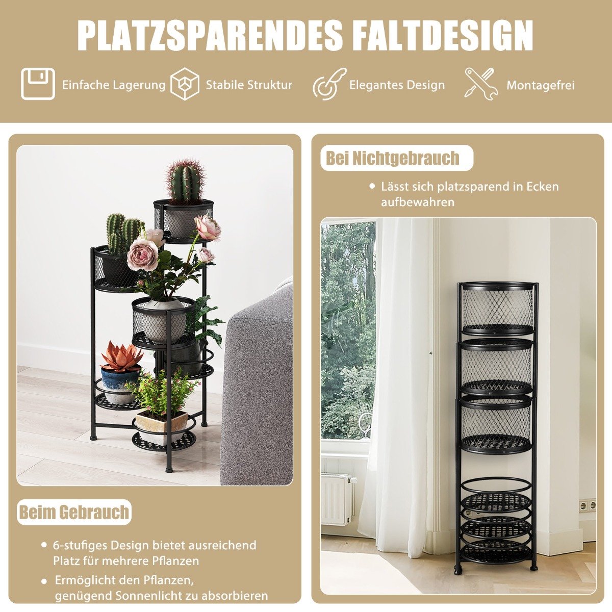 Embeleze seu espaço e sua vida com este inovador suporte dobrável para flores! Com 3 floreiras e 3 bandejas treliçadas, nosso suporte adiciona um visual em camadas ao seu espaço, permitindo que você exiba plantas de diferentes alturas de forma organizada. E a estrutura alta e baixa permite que as plantas em cada nível recebam luz solar suficiente. Além disso, a estrutura é feita de metal durável e à prova de ferrugem, que é à prova d’água e não se deforma facilmente. E a superfície metálica tem acabamento em um elegante tom dourado para fazer seu espaço brilhar. As 3 estruturas de suporte podem ser giradas com flexibilidade para ajustar o formato a diferentes cenários. Quando não estiver em uso, você também pode dobrá-lo de forma compacta para economizar espaço de armazenamento. Como não é necessária montagem, você pode desfrutar de um lindo suporte de exposição imediatamente após desembalar. Nosso suporte dobrável para flores é definitivamente uma decoração perfeita para sua varanda, jardim, quarto ou sala de estar. Características: 3 vasos de flores grandes e 3 bandejas de grade podem acomodar várias plantas em vasos Adotando uma estrutura alta e baixa para garantir que as plantas absorvam luz solar suficiente O suporte giratório pode obter diferentes opções de exibição de acordo com suas necessidades Pode ser dobrado para um tamanho compacto para fácil armazenamento A estrutura de metal resistente à ferrugem não deforma nem quebra facilmente As almofadas antiderrapantes protegem seu piso de arranhões A linda bandeja curva facilita a drenagem da água As bordas elevadas podem proteger as plantas em vasos de cair A aparência dourada adiciona um toque de elegância ao seu quarto A superfície lisa não tem rebarbas para fácil manutenção O design sem montagem economiza tempo e esforço