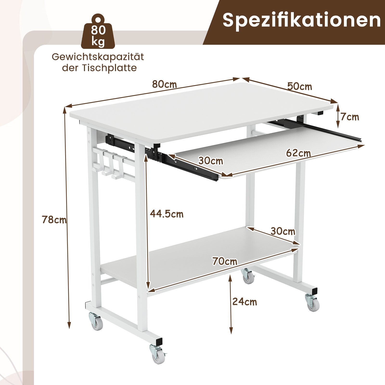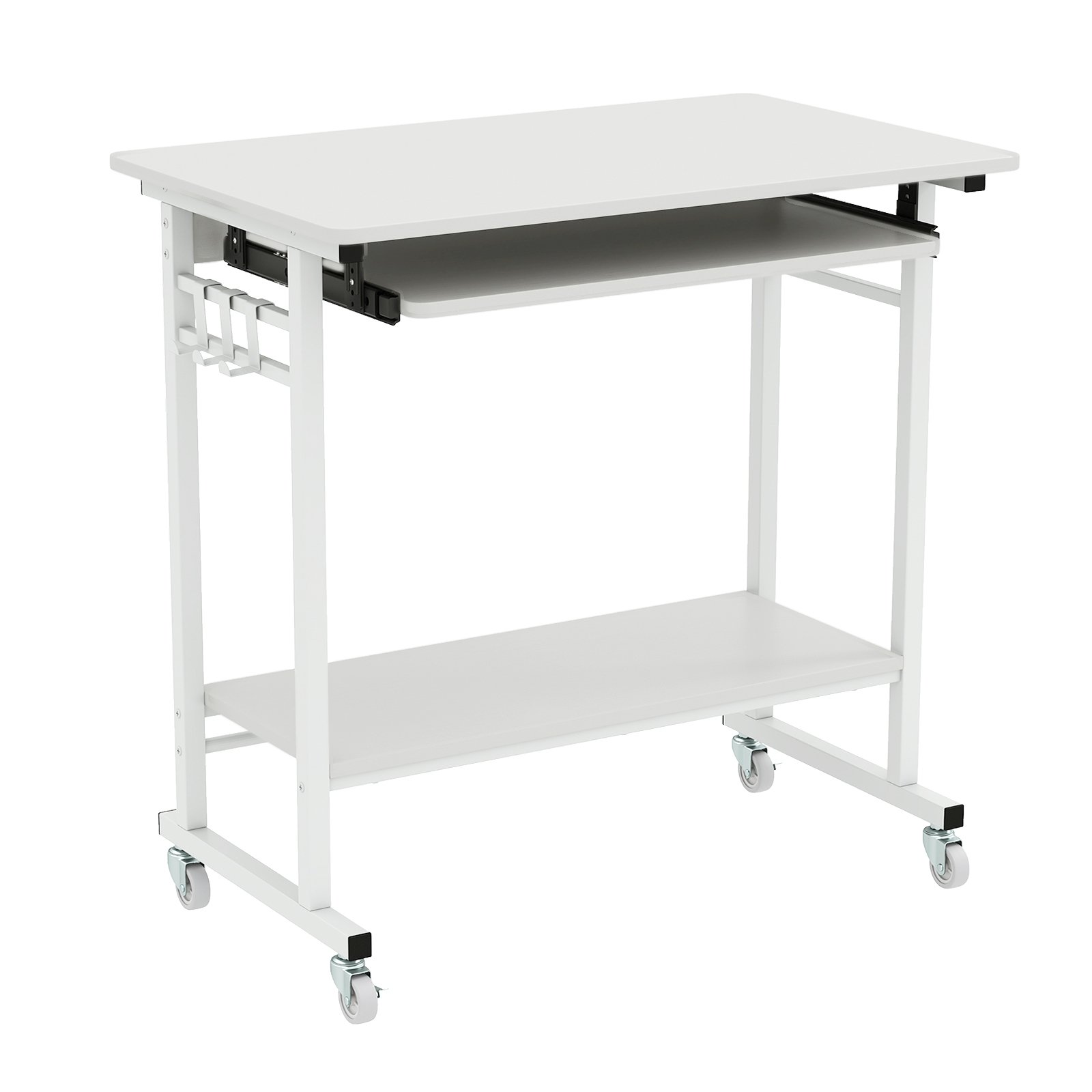 Mesa de computador branca com rodízios, bandeja para teclado, espaço de armazenamento embaixo e ganchos.