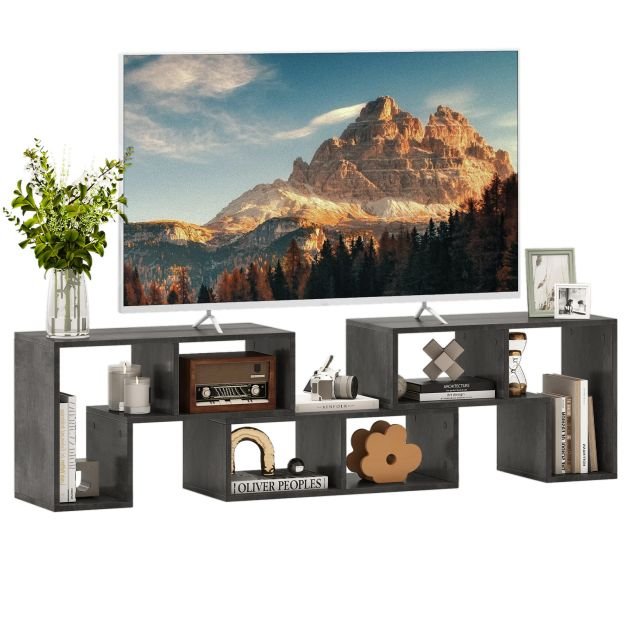 Quer adicionar espaço de armazenamento extra para manter sua casa limpa e organizada? Quer um suporte de TV elegante ou uma mesa de console para combinar com seu estilo de casa moderno? Este suporte de TV de console 3 PCS definitivamente satisfaz suas necessidades! É composto por 2 prateleiras em forma de L e uma prateleira retangular, oferecendo amplo espaço para uma televisão, reprodutor de vídeo, livros, CDs, vasos e vasos de plantas. Você pode combiná-lo livremente como quiser, tornando-o um suporte de TV, uma estante ou um armário de armazenamento comum. Além disso, feito de placa premium, o suporte de TV pode suportar grande capacidade. E diferentes estilos de combinação significam diferentes capacidades de carga. Além disso, existem muitas almofadas antiderrapantes para aumentar a estabilidade e a firmeza. Uma aparência simples e elegante adiciona um pouco de personalidade ao estilo da sua casa! Você pode colocá-lo na sala de estar, quarto, sala de estar, quarto, entrada ou corredor. Se você está procurando por um produto assim, não hesite em comprá-lo! Combinação Livre: O moderno console de TV vem em 3 peças, incluindo 2 prateleiras em forma de L e uma prateleira retangular, que podem ser combinadas de várias maneiras para diferentes propósitos. Por exemplo, as 2 prateleiras em forma de L podem ser colocadas na retangular e depois expandidas de 134 cm para 180 cm ou giradas para formar ângulos diferentes. Muito Espaço de Armazenamento: O centro de entretenimento de mídia oferece um total de 6 compartimentos abertos para ajudar a organizar os diversos e evitar desordem. Além disso, o tampo de mesa extensível é espaçoso o suficiente para TVs de tela plana de até 165 cm. E o design aberto o torna uma prateleira/estante de exposição perfeita para livros, enfeites ou coleções. Construção Resistente e Almofadas Antiderrapantes: Feito de madeira projetada com 15 mm de espessura, o móvel de TV de madeira pode suportar um peso considerável e fornecer uma longa vida útil. Vale ressaltar que a capacidade de carga da prateleira varia com o método de combinação. Além disso, as 3 peças de prateleiras de armazenamento são equipadas com almofadas antiderrapantes, que adicionam estabilidade e evitam arranhões. Estilo minimalista moderno: com linhas elegantes e uma aparência minimalista, o armário de suporte de TV respira um toque moderno em sua sala de estar. E você pode combinar as peças como quiser, expressando totalmente sua imaginação selvagem e gosto pessoal. Além disso, há adesivos combinando para cobrir os furos de parafusos feios para uma aparência limpa. Ampla aplicação e fácil montagem: com o tamanho ajustável e aparência moderna, a prateleira de TV livremente combinada pode ser usada como um console de TV, uma estante ou um suporte de exibição. Além disso, a configuração da unidade do console de TV também é fácil, desde que você siga as etapas nas instruções de montagem.