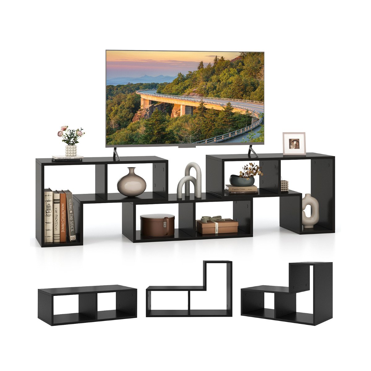 -Composto por 2 prateleiras em formato de L e uma prateleira retangular para diferentes combinações-O tampo da mesa espaçoso é adequado para TVs de até 65 polegadas-6 compartimentos abertos fornecem amplo espaço de armazenamento-Prateleiras totalmente abertas com altura adequada para fácil busca-Madeira projetada de grau E0 para maior segurança de uso-Placa de 0,60″ para melhor firmeza, sem se preocupar com deformações e rachaduras-Estrutura reforçada para suportar até grande capacidade de peso-Adesivos para furos de parafusos são fornecidos para criar uma aparência atraente-A superfície fácil de limpar pode ser facilmente limpa com um pano-O acabamento minimalista clássico adiciona uma atmosfera elegante e única à sua casa-Perfeito para sala de estar, quarto, entrada, corredor, etc.