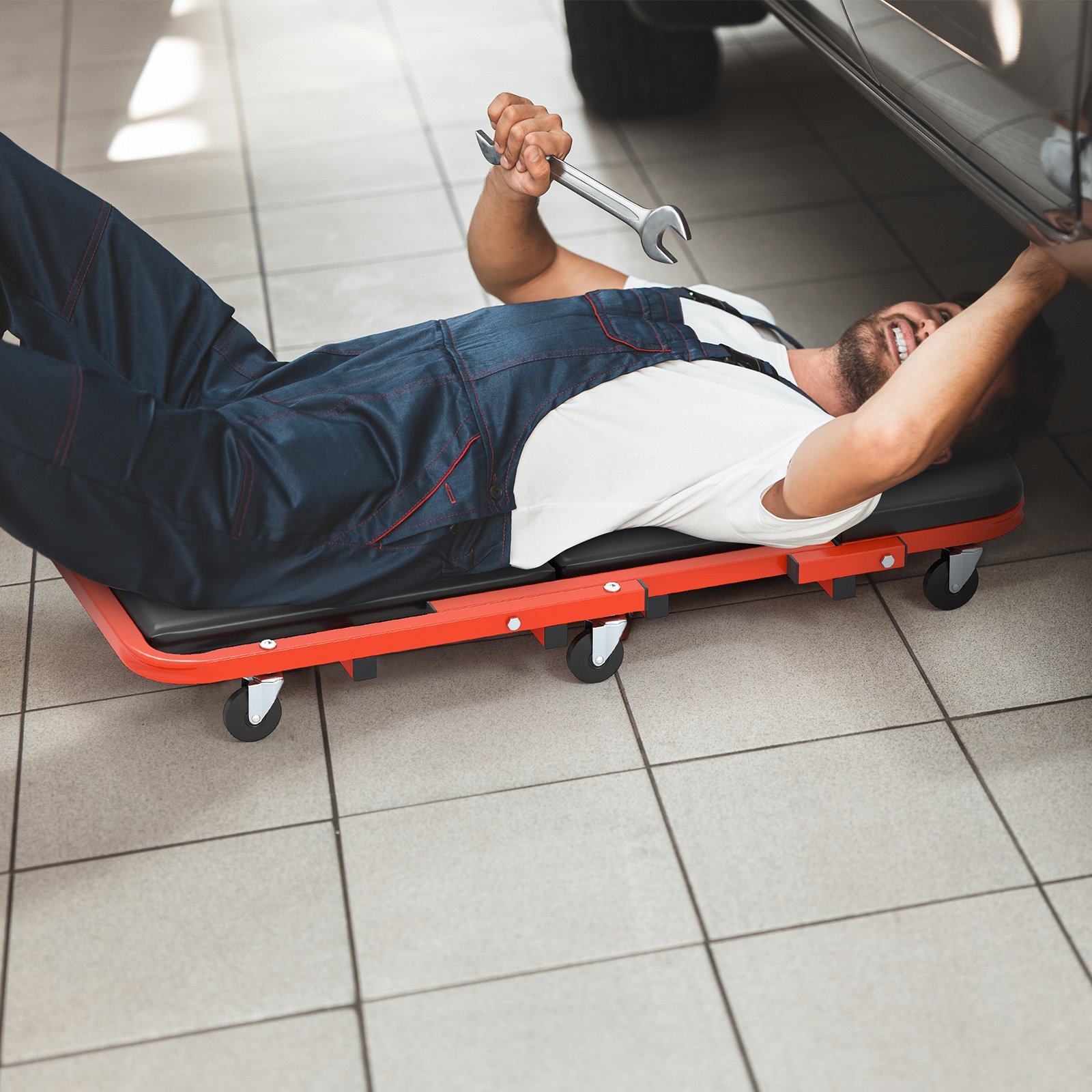 Tábua de montar oficina com 6 rodas e assento acolchoado, capacidade de carga de até 160 kg, vermelhaTábua de montar oficina com 6 rodas e assento acolchoado, capacidade de carga de até 160 kg, vermelha