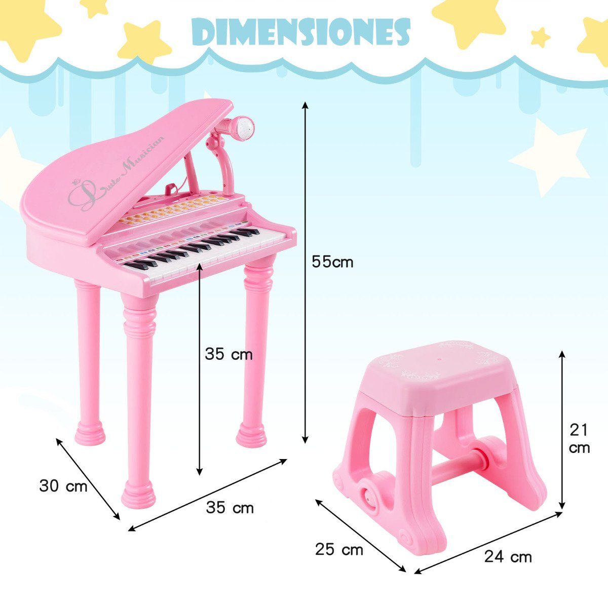 Teclado de piano infantil com 31 teclas, banquinho, microfone e tampa – Rosa