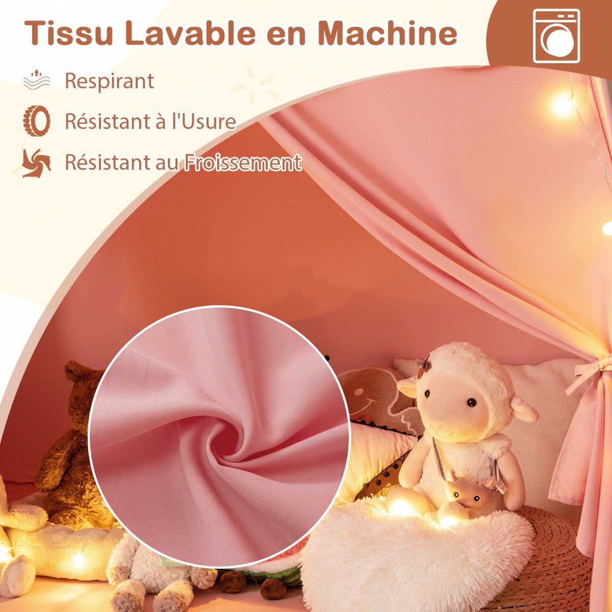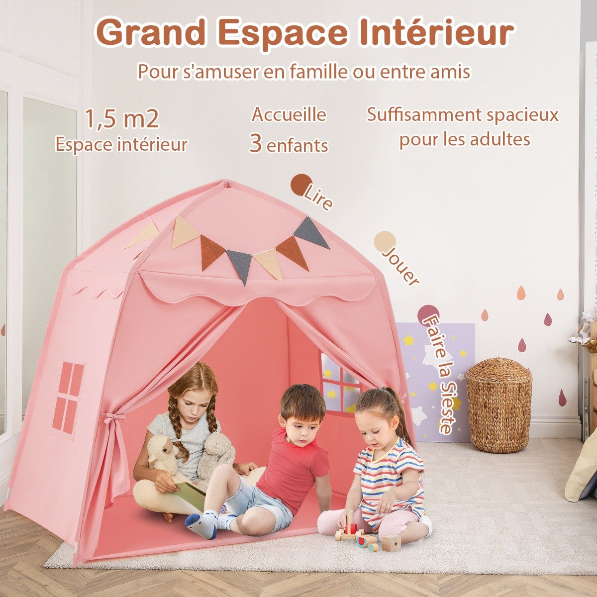 Tenda infantil para brincar com tapete acolchoado antiderrapante, bandeiras, luzes de corda, janelas para crianças de, bege