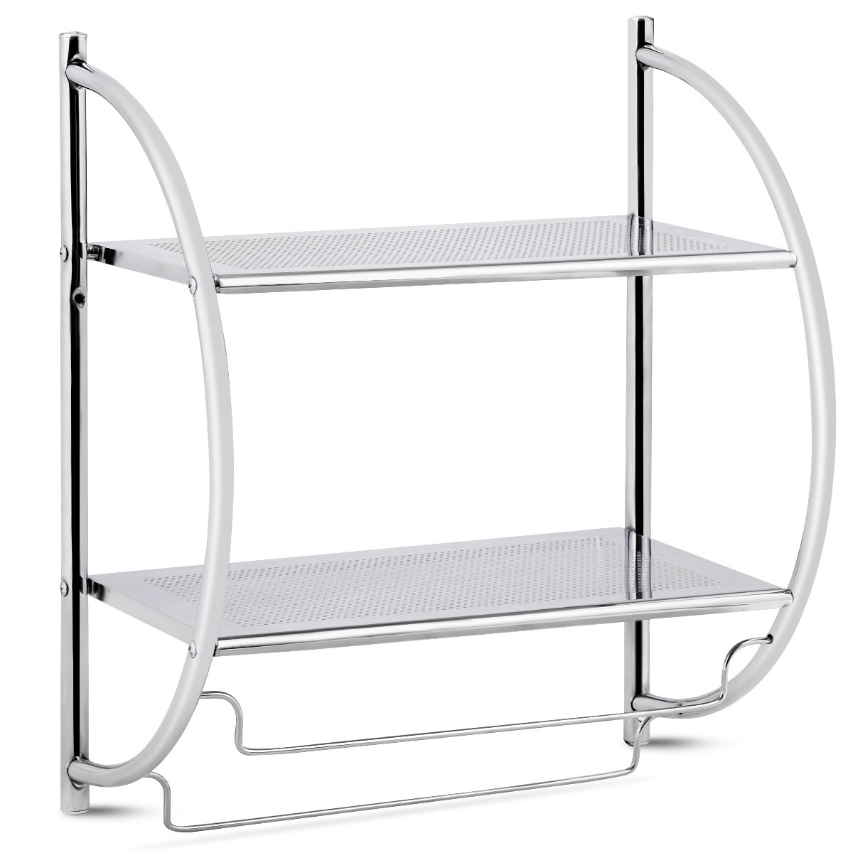 Esta moderna unidade de parede oferece amplo espaço para armazenar itens essenciais para o banheiro e para pendurar toalhas. O cromado sempre fica bem em um banheiro. As 2 prateleiras oferecem amplo espaço para itens essenciais para o banheiro, enquanto os 2 toalheiros oferecem muito espaço para pendurar toalhas. Não hesite em encomendá-lo agora! Espaço de armazenamento espaçoso: prateleiras de 41 cm x 22 cm de largura oferecem amplo espaço para itens de banheiro, como toalhas secas, loção e assim por diante. Com dois trilhos para pendurar na parte inferior, adequados para toalhas molhadas ou panos de rosto, etc. Estrutura resistente e material durável: a unidade de metal revestida de cromo é conectada com segurança para fornecer uma unidade forte e estável que é fixada na parede. O revestimento cromado é resistente à água, resistente ao desgaste e improvável de dobrar. Ampla aplicação: o cromado sempre fica bem no banheiro, mas esta unidade também pode ficar bem em uma cozinha, quarto ou sala de estar como uma unidade de exposição ou porta-tempero! Instalação rápida e fácil manutenção: seguindo as instruções detalhadas fornecidas, a unidade pode ser montada em pouco tempo e fixada na parede. A unidade pode ser facilmente limpa com um pano úmido.