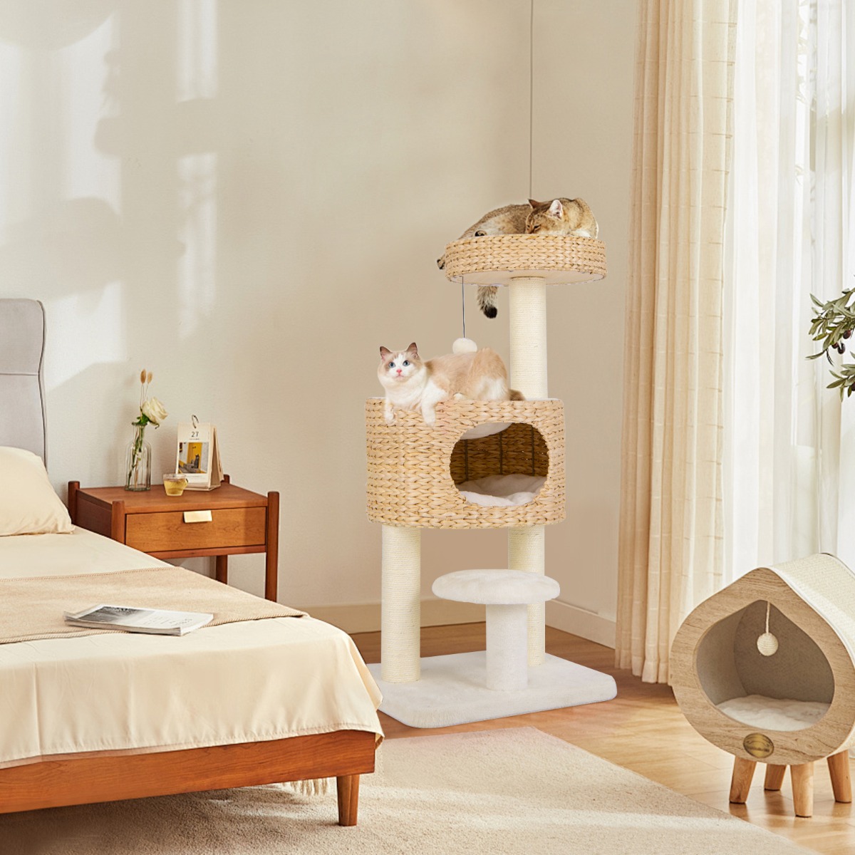Torre moderna para gatos com brinquedo pendurado e dispositivo anti-tombamento – Cor natural