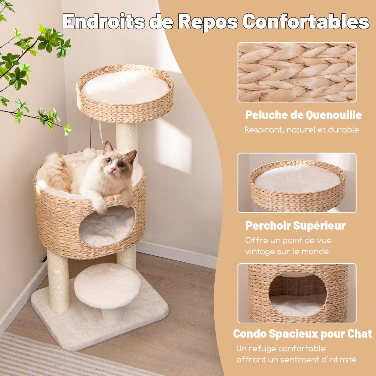 Equipado com um brinquedo interativo, poleiro superior, cama grande, cama de pelúcia e plataforma, o centro de atividades multiuso incentivará os gatos a explorar, brincar e descansar. Feito com penugem de taboa, o condomínio e o poleiro grande proporcionam um ambiente respirável e natural para seus gatos. Além disso, o condomínio e o poleiro são equipados com almofadas de pelúcia laváveis, que criam um ambiente aconchegante e limpo para seus companheiros peludos. Além disso, os arranhadores de sisal totalmente envoltos podem atender ao instinto natural dos gatos de arranhar e proteger seus móveis de danos. Graças ao dispositivo antitombamento e à base ampla, não há mais oscilações ou tombamentos. Com penugem de taboa natural e pelúcia branca, a árvore para gatos de vários níveis complementará o estilo do seu quarto facilmente! Ponto de bala: Refúgio tudo-em-um para gatos: Com poleiro superior, plataforma, condomínio e cama, a moderna torre para gatos oferece amplo espaço para escalar, se exercitar, pular e tirar uma soneca. Além disso, a incorporação de brinquedos pendurados proporcionará diversão sem fim para seus amigos peludos. Locais de descanso confortáveis: O condomínio e o poleiro para gatos são feitos de taboa trançada, o que garante durabilidade e respirabilidade. Além disso, as almofadas internas removíveis e laváveis garantem fácil manutenção. Além disso, a árvore para gatos com superfície coberta de pelúcia proporcionará um espaço convidativo para os gatos. Satisfaça os desejos naturais dos gatos: Equipado com postes de arranhar de sisal totalmente envoltos que atendem ao instinto natural de arranhar do seu gato, os móveis do condomínio para gatinhos não só protegerão seus móveis de danos indesejados, mas também ajudarão a manter as garras do seu gato saudáveis. Construção segura e resistente: Com uma base larga e espessa, a árvore para gatos de interior apresenta robustez excepcional, capaz de suportar até 15 kg. Além disso, o dispositivo antiderrapante incluso fixará a árvore para gatos firmemente à parede, evitando o risco de tombamento. Estilo natural e simples: com pelos naturais de taboa e pelúcia branca, o playground para gatos é um complemento esteticamente agradável para qualquer decoração. O design moderno e minimalista combina perfeitamente com vários estilos de interiores, aprimorando a aparência geral da sua casa.