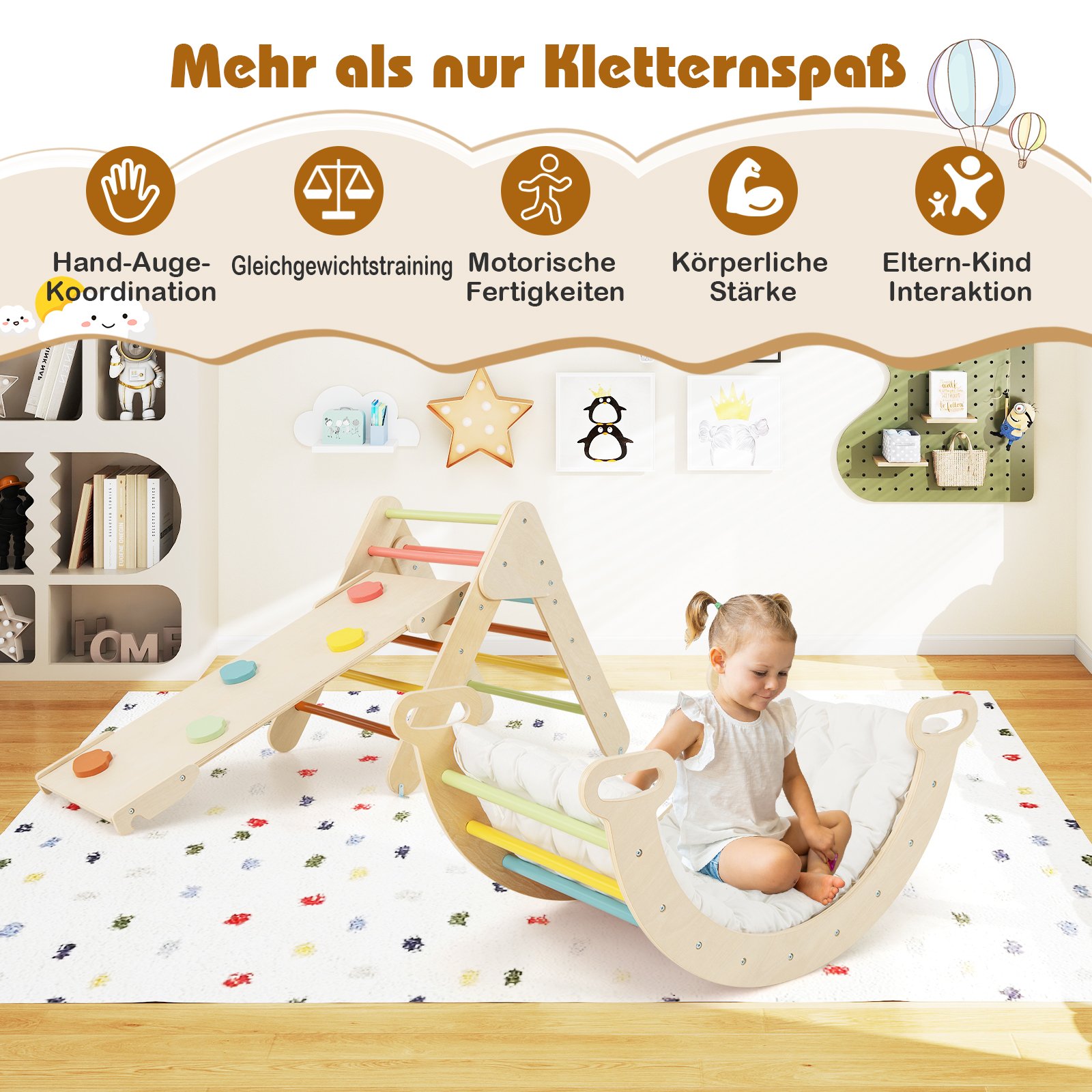 Triângulo de escalada com escorregador e arco de escalada e rampa dupla face, estrutura de escalada natural
