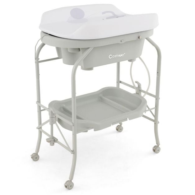 Trocador de fraldas com banheira dobrável de 20 litros, almofada de PVC 4 em 1, 4 rodas universais, capacidade máxima de 35 kg, para bebês de 0 a 12 meses, cinza claro.